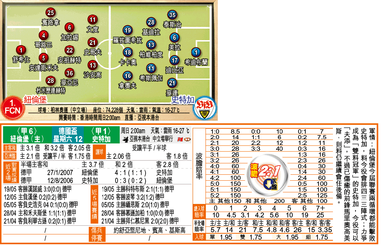 史特加及紐倫堡周六在柏林奧運球場爭奪今屆德盃冠軍,論牌面史特加高一籌,但他們在贏得德甲冠軍後連日開派對慶祝,恐影響狀態,加上近屆與紐倫堡交手多處下風,故「讓球」要讓平/半,一於吼下盤,兼補紐倫堡W。(球賽編號:星期六12;亞視本港台明日2:00am直播)