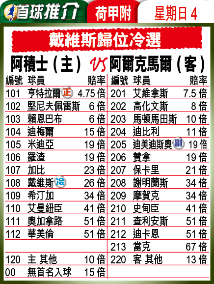 唔好忘記,季尾銳氣已洩嘅阿爾克馬爾,呢場仲有上場首開紀錄嘅中場施奧馬停賽,而且佢哋近屆訪阿積士又表現一般,只得1和5負,今場冇上場咁好彩,喺最後1分鐘入波贏埋咯。勇者更何懼博埋有3倍以上嘅「讓球主客和」嘅「主勝」。
