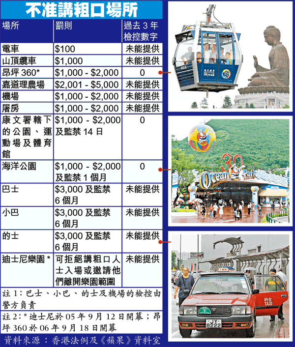 粗口禁區包羅萬有,除兩鐵外,乘搭電車、巴士、小巴、的士等公共交通工具也禁止講粗口。多個遊客必到之處如昂坪360、山頂纜車、廸士尼及海洋公園,也是粗口禁區。違例者一經定罪,除可被罰100至3,000元外,也可判監禁1至6個月。廸士尼發言人稱,遊人在樂園內講粗口雖不會被判監,但廸士尼有權趕走失言遊人。