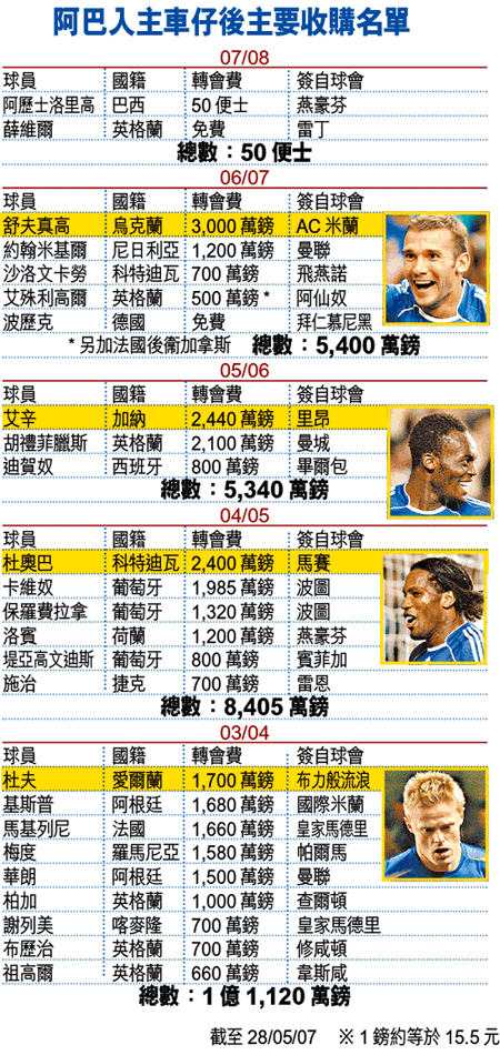 坐擁110億鎊(約1,700億港元)身家的阿巴莫域治,向來視錢財如糞土,自在03年夏天入主車路士後,動輒以千萬鎊羅致一名球員(見附表),過去4季便合共花了近3.4億鎊。然而,這名俄羅斯油王因與第二任妻子伊蓮娜離婚而可能被分掉60億鎊身家,加上要花時間陪新女友達莎周遊列國,故對車路士的熱愛程度亦大減,不再像以往一樣有求必應,並要求球會以現有的資源來運作。