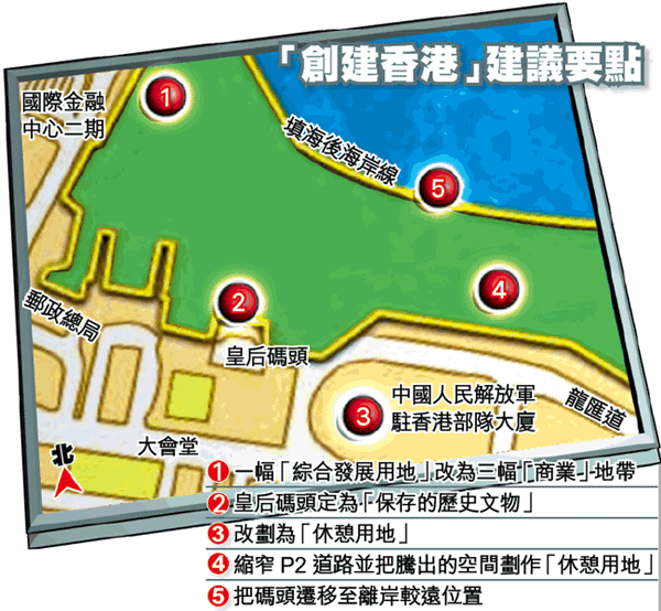 「創建香港」的建議大刀闊斧,大幅刪減政府劃定的商業用地,把中環國際金融中心第二期日後可能出現的16米高、400米長的摩地大廈化整為零,將部份用地改為休憩用地,以免遮擋現時遮打花園及皇后像廣場向海的景觀;再把本為一幅的綜合發展區用地分為三塊較小的商業用地,讓不同發展商互相競爭。