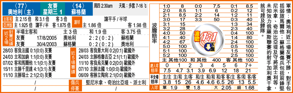 儘管蘇格蘭周三作客維也納的友賽只能派出弱陣,但觀乎奧地利欠缺級數,加上實力重回歐洲二線頭的蘇格蘭,前線快速銳利,受讓平/半,實向下盤埋手。(球賽編號:星期三1;香港時間明日2:30am開賽)