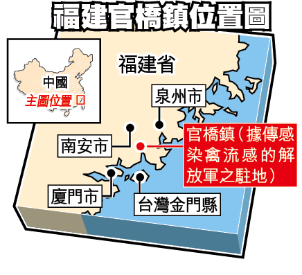 上周六衞生部公佈19歲姓程軍人感染禽流感後,隨即有內地網民在網上爆出軍人是駐守在福建南安市官橋鎮。官橋鎮居民羅小姐對本報稱,上周從同事口中聽說有駐鎮解放軍染上禽流感,她亦甚為擔心,會減少與雞隻接觸及食雞。官橋鎮仙枝村附近有居民亦說,近日有官員撲殺雞鴨,並替家禽注射禽流感疫苗。