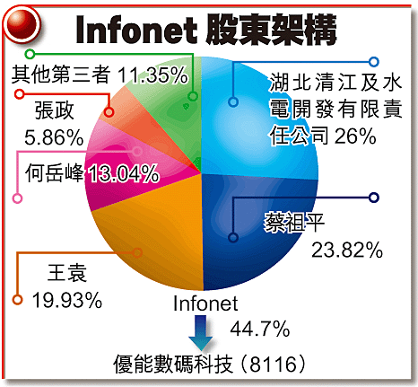 睇番吳副主席同埋孫執董嘅背景,兩人現時全職喺湖北清江水電開發有限公司做嘢,吳生係副總經理;孫生係紀委書記。本來身兼多職,被人怪責難免。但兩位人兄由第一日做董事,已經申報呢個職位。呢間湖北清江並非第三者,根本係優能數碼嘅最終大股東。優能嘅大股東係Infonet,而Infonet嘅大股東就係湖北清江(見表)。