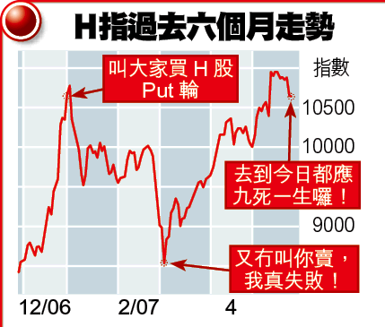 「有血」因為要蝕錢,「更有淚」嘅原因係H指喺06年最後一個交易日收報10340點(見圖)。不過,短短兩個幾月之後,下跌至3月5日收市嘅8528點,跌幅有17.5%。隻3497亦最高見0.305元,比推介價高80%。因為當時我冇叫大家賣咗佢,所以令到catfukwai寫電郵嚟。