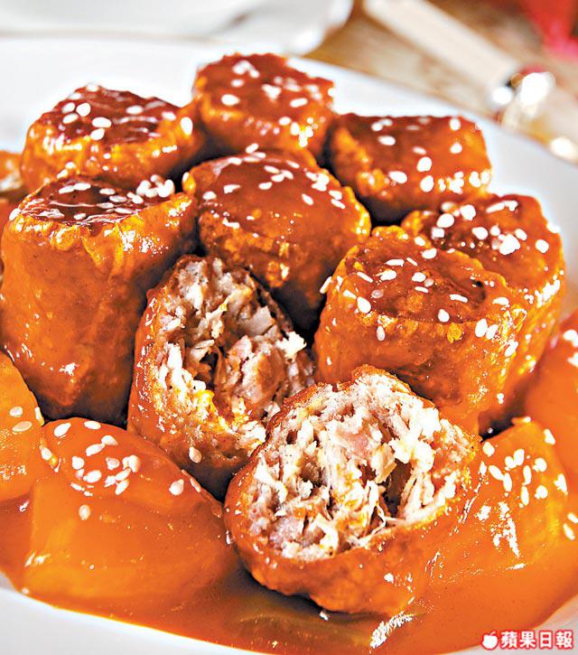 做法:豬肉以生粉/蛋白醃15分鐘備用;芋頭/馬蹄切幼絲,將芋頭絲炸至金黃備用;以腐皮包捲豬肉/炸芋頭絲/馬蹄絲,放入熱油中炸至金黃,撈起瀝油。最後將青椒/紅椒/菠蘿粒加入汁料煮滾,淋上肉卷面即可。