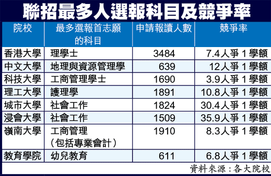 以八大比較,理大的社會政策及行政課程,競爭最為激烈,選報首志願的人數為1,324人,學額為25個,競爭率達53人爭1學額,而浸大的社會工作學士課程競爭率亦高達35.9人爭1學額,報讀人數達1,509人。在考生改選科後,港大理學士及工商管理學士課程選報為首志願的人數卻分別下降13.95%及4.92%。