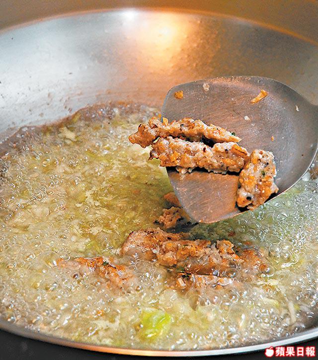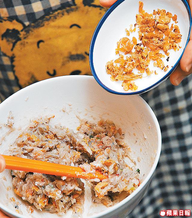 2.鯪魚肉加入爆香的蝦米/冬菜/葱花/醃料,撈勻後撻打至起膠,用湯匙批魚肉放滾水中烚熟。瀝亁水後,煎至表面金黃。