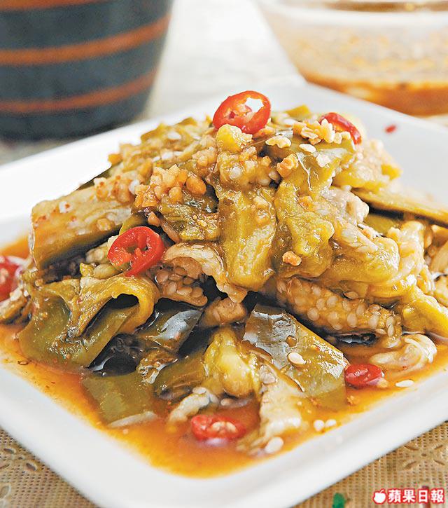 做法:茄子切約3吋長粗條,隔水蒸10分鐘,取出,待涼後撕成絲。辣椒仔切碎,連同涼拌汁料一起拌勻成涼拌醬,臨食前才淋到茄子上。