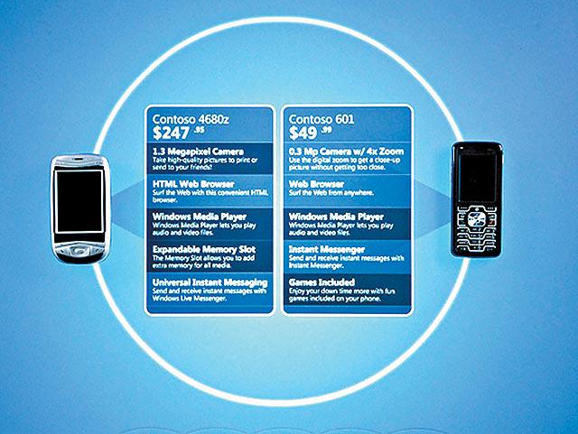 買手提電話,不再需要企在街上聽推銷員意見,因為平面電腦有辨別不同手機的能力,顧客只要將心儀電話從示範架拿下,放在屏幕上,電腦掃描出手機上的條碼後,就會立即顯示手機的詳細資料,包括功能和價錢。如果將兩款手提電話同時放在屏幕上,更可以比較一番。如果將電話聆聽的標記手指「拉向」電話,就可試聽這些音樂聆聲。