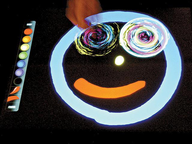 這是一塊多功能畫板,大人小孩只要進入電腦顏色盤,用手指或畫筆點在顏色盤上,就可直接在螢幕上畫畫。由於內置的5部攝影機能分辨用者或多名使用者的手指,即使用上10隻手指畫畫,甚至和朋友一起在螢幕上畫畫,電腦都可同時處理。平面電腦還會辨別物體,若你將骰子的立體物體,輕輕點一點畫面,就會出現會轉動的圖像,令畫面變得更立體。