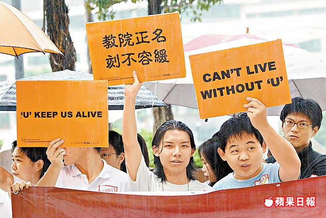 一群教院學生代表昨晨冒着大雨,趁校董會開會前,向校董會主席梁國輝送上一張「正名期票」,要求他寫明何時會正式向政府申請正名為大學,但梁未有應允。