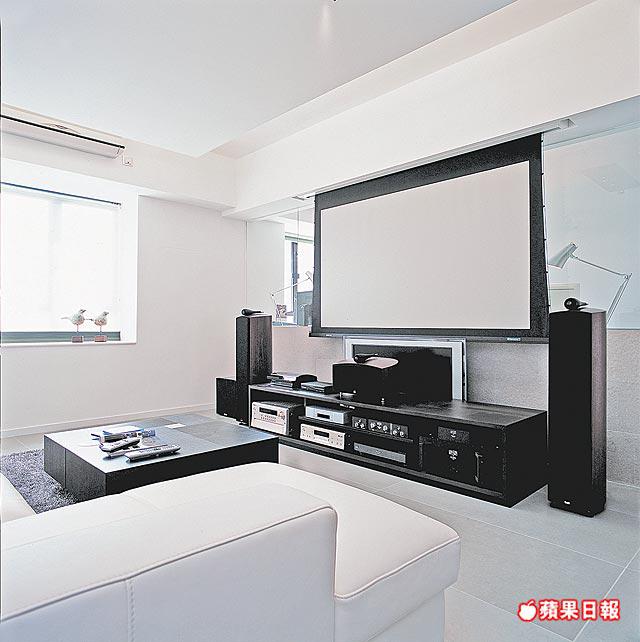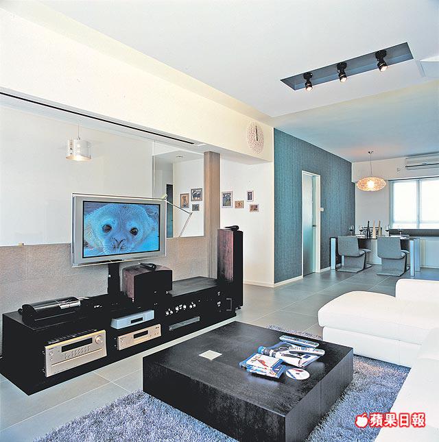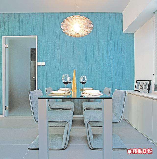 設計師選取白色作全屋的主調,讓室內倍添平和自然的感覺,同時於飯廳佈置一幅孔雀藍色的牆壁,配搭柔和亦不失單調。此牆壁除了色彩特別外,質感鮮明粗糙,一摺一摺的紙紋亦富大自然氣息。在極具線條美的餐椅配襯下,整體格調簡約時尚。全屋構圖簡單,但蘊藏着一套Lutron智能系統,此系統將音響、燈光、窗簾、投射機等裝置連接在一起,透過遙控器便可一概操控各設備,讓屋主輕鬆自在地享受生活。