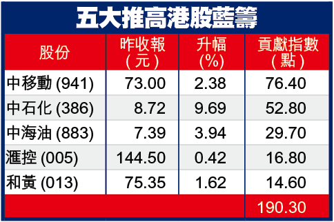重磅股中移動(941)彈高1.7元至73元,加上股價急升近一成至8.72元的中石化(386),合共推高恒指近130點。大笨象滙控(005)微升0.6元至144.5元。本港時間昨晚11時,三者在美國預託證券折算分別報73.3元、8.52元及145元。