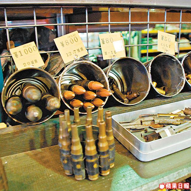 二樓主要賣軍褸、帽、背囊、子彈等裝備。來自美國卡羅來納州的Veronica跟哥哥就拿着不同的防備帽、盔甲等又試又戴,簡直像玩化裝舞會,當那裏是遊樂場。「我爸媽都是來美軍基地工作的,這些東西我都沒試過,甚至沒看過,很有趣呢!」