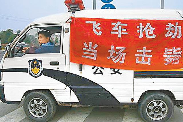 「史上最牛的廣告橫幅!」夏季是飛車搶劫案的高發期,河南鄭州豫龍鎮派出所公安昨日在鄭州中原西路持槍值勤時,特別在警車上掛起「飛車搶劫當場擊斃」的紅布,以此震懾不法分子。雖然「當場擊斃」這一警告語「過激」,但大部份網友都強烈支持公安這樣做法,顯示網友們對飛車搶匪猖獗深惡痛絕。
