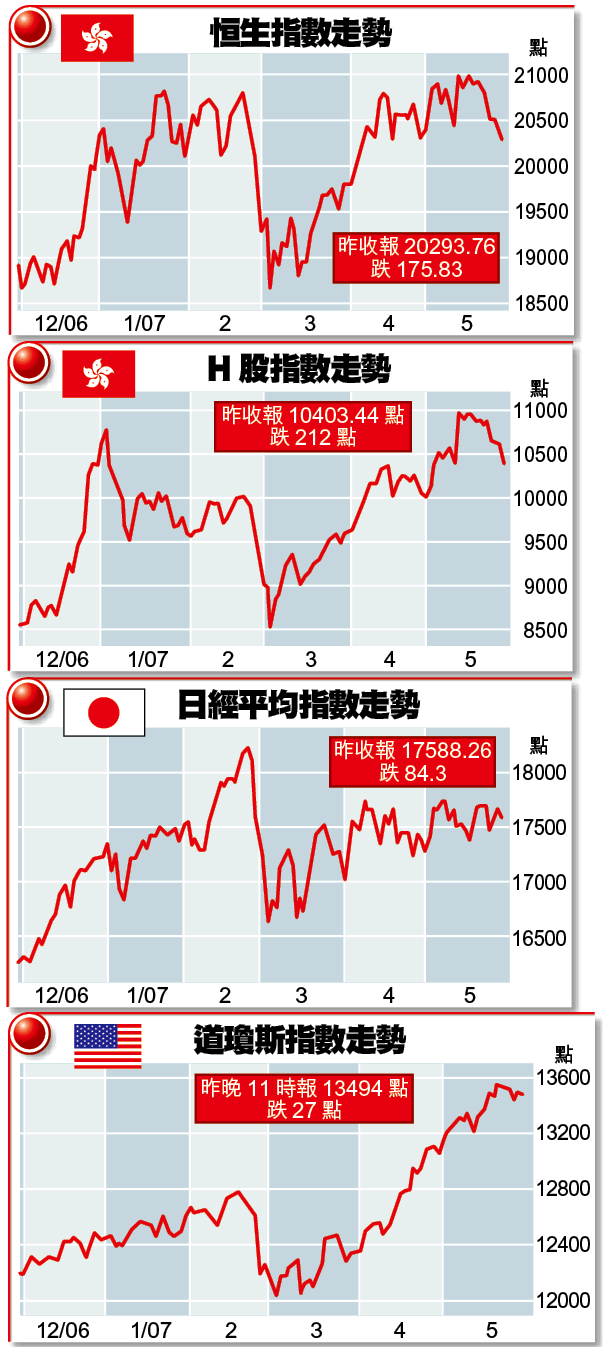 恒指昨日失守50天移動平均線(現處20332),跌幅最大四隻藍籌全屬中資股(見表)。重磅股中移動(941)跌0.45元至71.3元,滙豐控股(005)則充當定海神針,平收143.9元。本港時間昨晚11時,除滙控在美國預託證券(ADR)微升外,中移動、中石油(857)及國壽等ADR,較港收市略低1%之內。