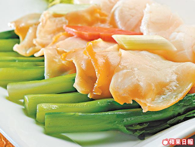材料:澳洲帶子21/2両、螺片2両、芥蘭4両、雞湯100毫升、糖21/4茶匙、鹽1/4茶匙、雞粉1/2茶匙、生粉1茶匙