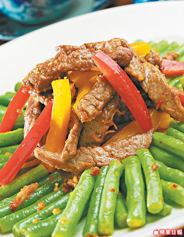 材料:四季豆4両、牛柳4両、青/紅/黃椒粒各適量、鹽/生粉/老抽各1/4茶匙、糖1/2茶匙、XO醬1茶匙