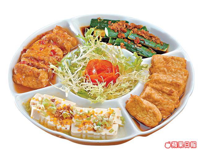 做法:將1/3盒豆腐切片,鹹蛋黃蒸熟壓碎,連同金華火腿茸鋪上豆腐上碟;其餘2/3盒豆腐切片,猛火油鑊略炸,撈起瀝油,放入滷水汁浸入味,將半份滷水豆腐上碟;將雞醬/XO醬/豆瓣醬混合,淋上另一半滷水豆腐上碟;日本青瓜切幼條,淋上蒜茸/豉油伴碟。