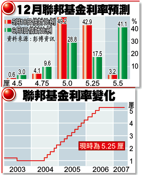 自04年6月底開始,聯儲局展開了一連17次的加息行動,聯邦基金利率由1厘的紀錄低位攀升至5.25厘,市場開始估計美國息口已見頂,而在其後的7次議息會議,聯儲局按兵不動,但卻不斷提醒市場通脹仍有惡化風險。上周三發表的會議紀錄亦反映,雖然樓市調整期將較預期長,但美國經濟下滑的風險已減少,當局最關注仍是通脹問題。