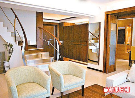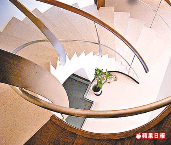 分層的複式單位內設有瑰麗的樓梯,設計師精心挑選獨特的天花燈以配合螺旋形樓梯的深度及扶手的線條。階梯底下是一個小型魚池,有別於放置魚缸般平凡刻板,魚池選取黑石作用料,在深木色佈置的傳統中國味客廳中,加插一點時尚的格調。