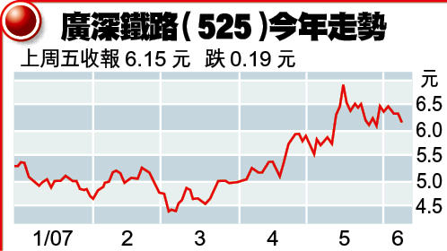 該行稱,廣深鐵路自收購廣坪鐵路後,客運及貨運能力已大大提升。廣坪鐵路享特殊運價浮動待遇,可不經審批與國鐵同步加價,若客運價調高5%,公司純利將增14.98%;若貨運價調高5%,純利則增3.08%。廣深鐵路今年股價已升16%,今、明兩年每股盈利預期分別為0.23元及0.26元。