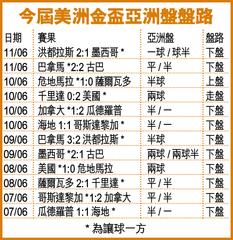 翻查金盃至今共12場亞洲盤戰績(未計周一賽果),盤路竟是1上盤、1走盤及10下盤;反映這項盃賽確是爆冷溫床,單看主辦國美國首戰僅勝危地馬拉1:0,以及淨勝千里達2:0走盤的盤路,便知上盤博唔過。另一熱門墨西哥亦遭滑鐵盧,上場反輸洪都拉斯1:2可見一斑。