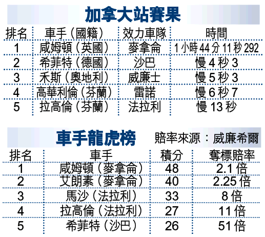 一級方程式(F1)踏入新時代!之前連續5站打入三甲、麥拿侖車隊的英國年輕小將咸姆頓,周日於加拿大站更上層樓,成功踏上頒獎台最高處之餘,更成為首位贏得冠軍的黑人車手;賽後咸姆頓以48分高踞車手積分榜首位,為F1車壇注入一股銳不可當的「黑勢力」!