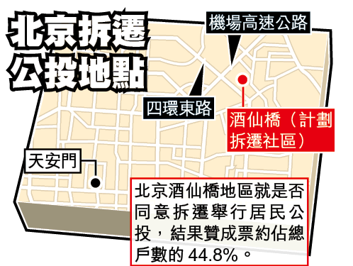 北京酒仙橋地區的居民前日就是否同意開發商的拆遷方案舉行公民投票。這是內地首次就拆遷舉辦公投,罕有的民主方式,加上這次舊區重建是北京歷來規模最大的單一拆遷項目,公投備受關注。結果,5,473戶居民中有3,711戶參與公投,贊成的有2,451票,反對1,228票,無效32票,1,700多戶棄權。