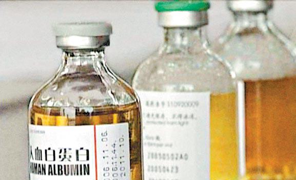 主要用來注射入病人體內的人血白蛋白,主要用來救治腦水腫、肝硬化等重症病人。吉林省食品藥品監督管理局早前抽驗發現,包裝標誌為「北京天壇生物製品股份有限公司」和「德國杰特貝林製藥有限公司」等5家企業,生產的7個批次人血白蛋白為假藥,完全不含蛋白質,並查封有關產品,其後更發現假藥並非這些藥廠所生產,產品上的標誌也是偽造的。