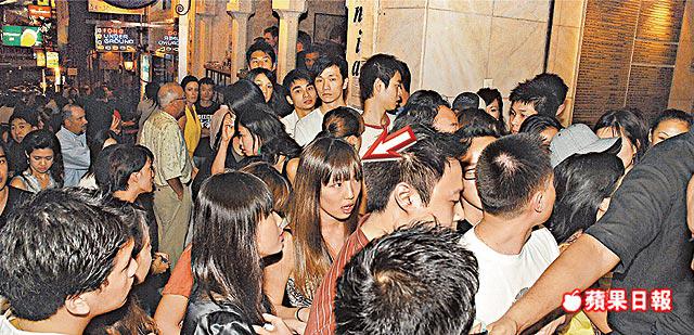 其間有一名穿灰色tee的外籍男子上前向霍詠詩等搭訕,後來發現有記者時,霍詠詩的友人即用黑色圍巾遮着她,一會兒後見原來一早已在場內狂歡的觀音兵JC出來救駕幫她們「打尖」,但她們仍要再等10分鐘才能入內。