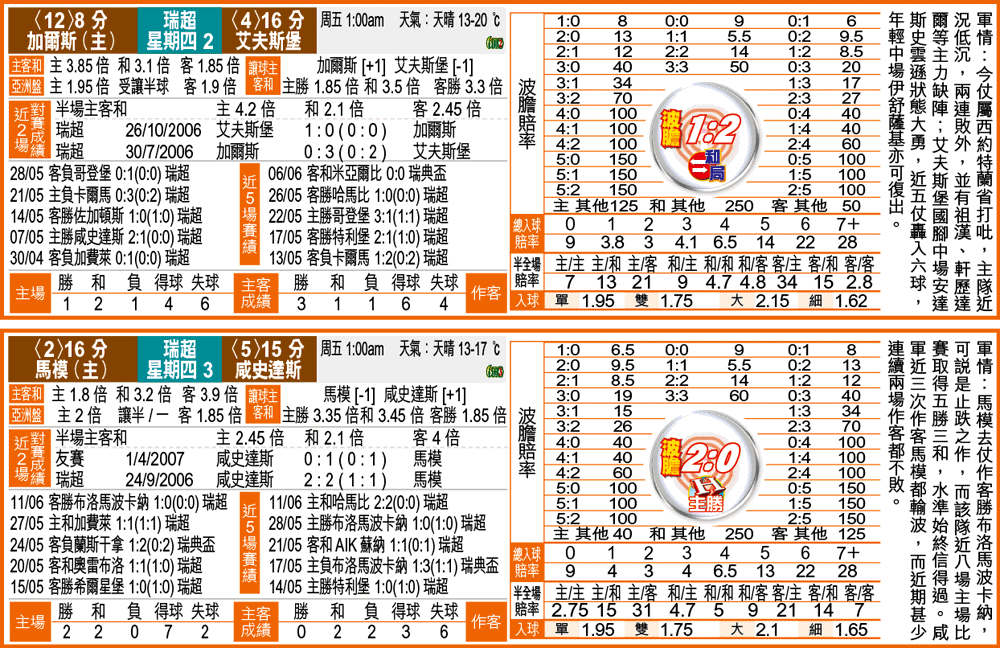 周四瑞超聯上演西約特蘭省打吡,衞冕的艾夫斯堡重拾班霸本色,無懼作客省內實力最弱的加爾斯,艾夫斯堡1.85倍客W可捧。