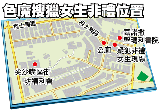 警方稱,自上月中開始,嘉諾撒聖瑪利書院後門對開,曾發生最少四宗非禮案,受害人均是該校女生。綜合所有女事主的描述,每次案發於早上7至8時上學途中,遭人迎面拍胸非禮,而涉案色狼年約40歲及5呎7吋高,犯案時穿着T恤、孭着黑色背囊及戴上金絲眼鏡,相信屬同一人所為,他犯案後迅速逃去。