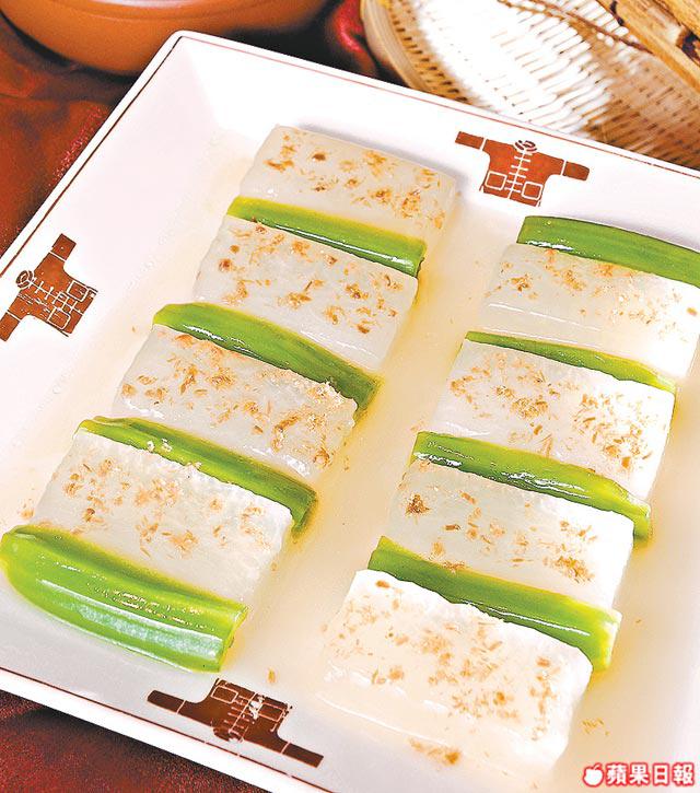 材料:冬瓜1斤、金華火腿茸少許、雞湯1/2杯、生粉2/3茶匙、鹽少許、芥菜8條