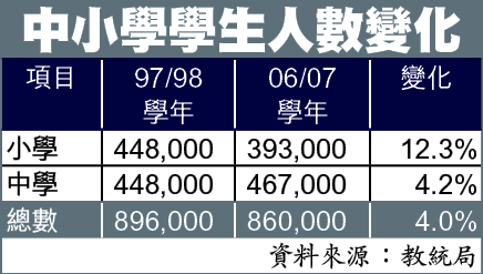 在07/08學年,入讀小一的人數將跌至回歸後的新低,只有4.6萬人,可以預見未來中學生人數也逐年減少,小學縮班情況或蔓延至中學。