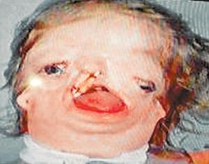 沒有下巴很可憐,沒有臉孔同樣悲慘。美國人形容她是「沒有臉孔的天使」,她的名字叫韋特莫爾(JuliannaWetmore),她現年4歲,天生患有罕見的TreacherCollins症候群,臉部少了30%至40%的骨骼,沒有上顎,沒有頰骨,沒有眼窩,沒有耳朵,沒有鼻子,是個沒有臉孔的女孩。