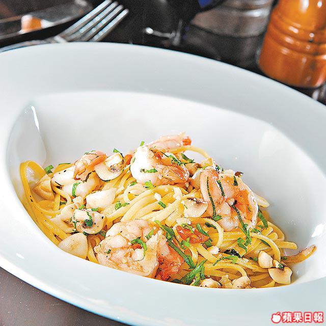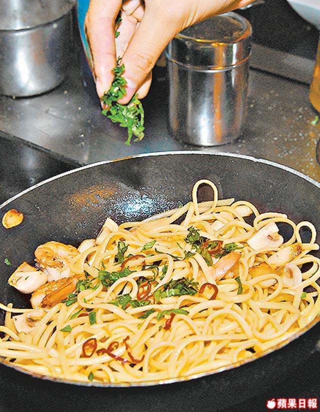 材料:扁意粉300克、細蒜頭2粒(切片)、辣椒1隻(切絲)、羅勒葉4片、蝦10隻、蘑菇6粒、橄欖油3茶匙、鹽/胡椒粉/水各適量