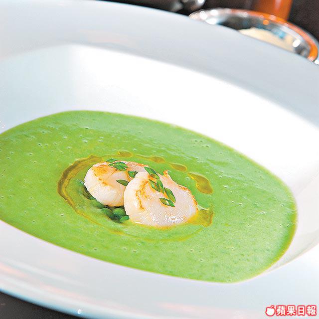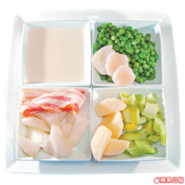 材料:青豆200克、細薯仔1個(切件)、洋葱1/2個(切粒)、大蒜2條(切粒)、芹菜3細條(切塊)、煙肉1片、忌廉250毫升、帶子4粒、水1公升、鹽/胡椒粉各少許