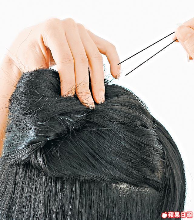 1.先把額前頭髮向後梳,用hairspray定型,大約用頭頂1/3頭髮,連同額前頭髮束好,把髮尾向左邊扭,以同一方扭兩次,結成小髻。
