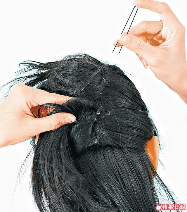 2.再把腦後頭髮束起,以同一個旋轉方法扭向上,用髮夾定好旋轉位,再噴hairspray定型。