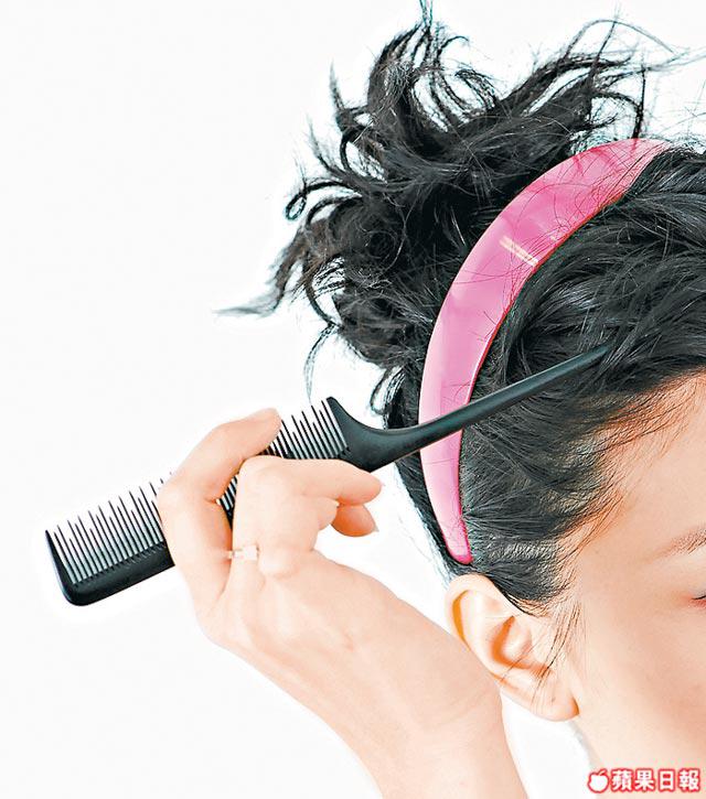 4.帶上喜愛的頭箍後,不想前額頭髮捲起太普通,可以嘗試用扁平梳末端,輕輕力隨意挑起額前頭髮,塑造不規則的層次感。