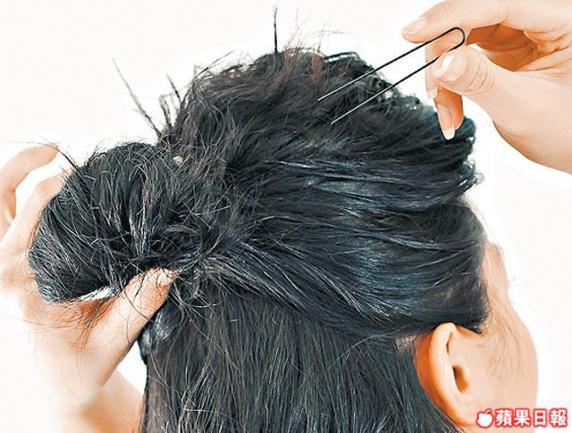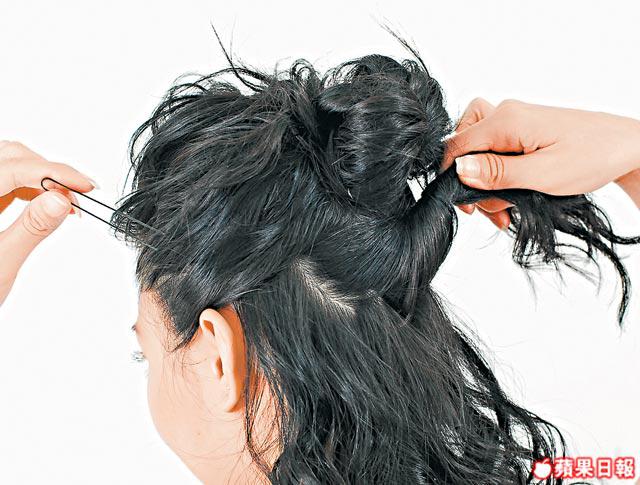1.把頂頭頭髮約1/3束起,然後從髮尾旋轉扭向上,用髮夾夾好鬆出來的地方,而髮尾可用扁平梳梳鬆。