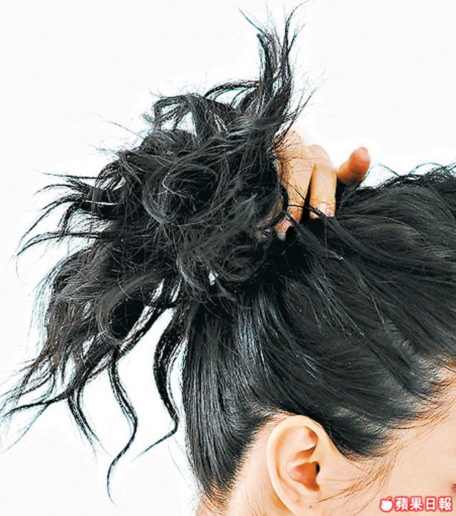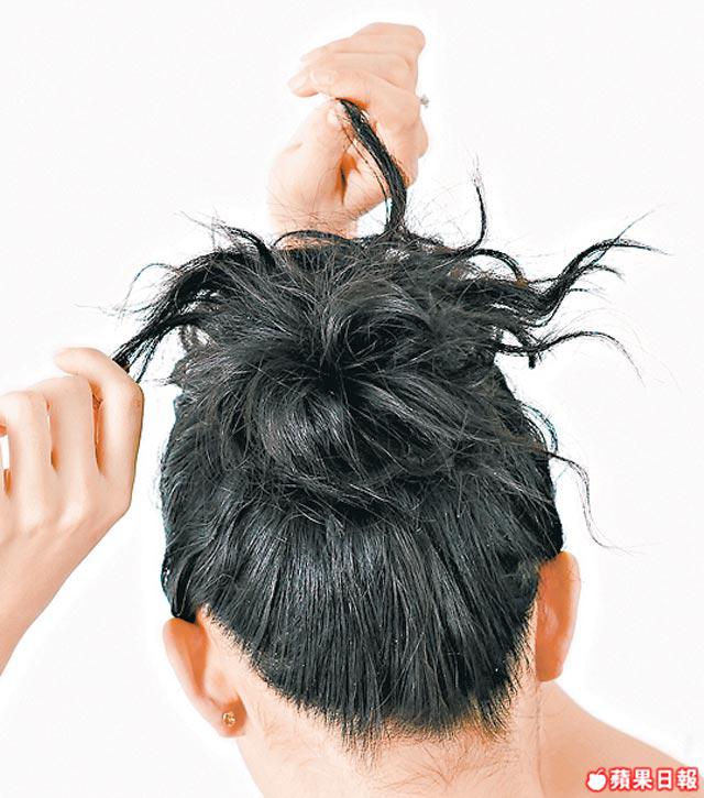 3.髮髻完成後留下的髮尾,用來玩層次,把大部份髮尾完全撥至頭頂,然後左中右分開小段頭髮。