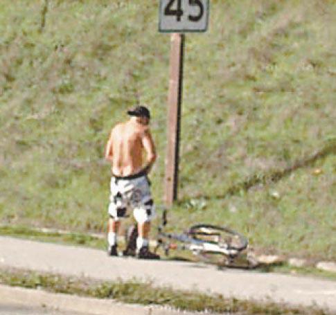 一名單車客赤膊上陣,在三藩市(SanFrancisco)的(Cabrillo)高速公路風馳電掣時,人有三急,高速公路哪有廁所?他只好跑到路邊小解,露出半截屁股,認真醜怪。