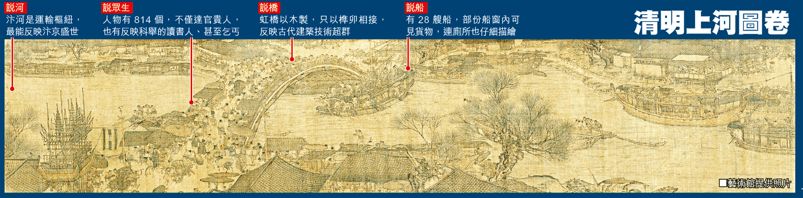 長達五米的圖卷,有814個人物、28艘船、170多棵樹木、20輛車、8頂轎;商店繁多如酒家、邸店、香藥舖、醫藥舖,更有從西北塞外而來的駱駝商隊,展現前所未有的商業都會。圖中巨大拱橋為虹橋,由巨木組成拱骨,拱骨之間只以榫卯相接,毋須鐵釘或磚泥,是當年中國建築史、乃至世界建築史上的一項成就。現代專家曾依圖建橋,證明確實十分穩固。