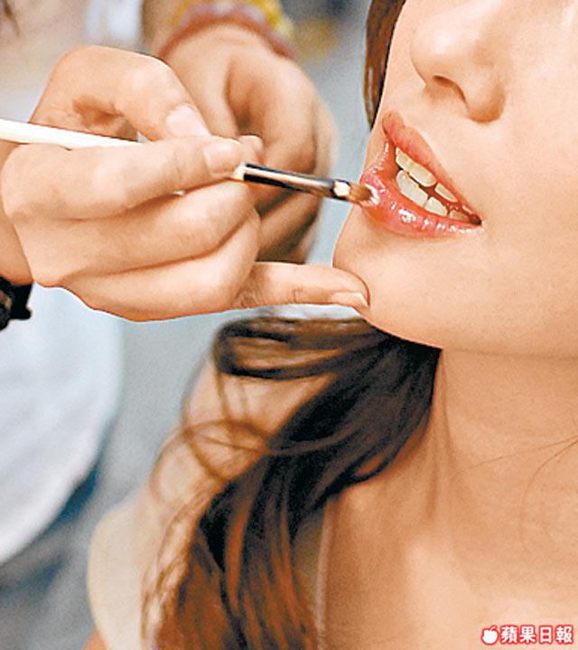化妝師Meegan話,「由於服飾的色調柔和,所以眼影都會以她喜愛的啡色為主。不過車厘子的顏色較搶眼,所以眼影顏色要較濃,方可突出眼的線條。而既然強調眼影顏色,胭脂就不宜太Sharp,Basic的粉紅色已能突出面部輪廓。」