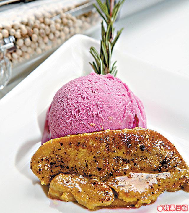 做法:鵝肝灑上海鹽/黑胡椒碎後,於表面沾上天婦羅粉。燒熱鍋,中火煎鵝肝至金黃色上碟,食時放提子雪葩和鵝肝一起吃。