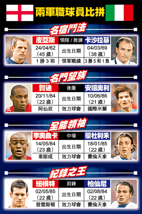 現時兩人分別是國家U21隊的主帥,今仗勝負決定兩軍的出線機會,關鍵還看兩昔日名將如何善用手上「籌碼」。卡沙拉基重用去季長期養傷的國際米蘭中堅衞安祖奧利;同樣是2號仔,英軍的阿仙奴右閘賀廸亦深得皮亞斯器重。