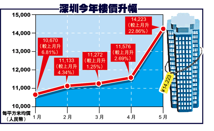深圳樓價不斷飆升,5月份樓價較4月急升近23%,達到每平方米14,223元人民幣(每平方呎約1,422元港幣),亦較去年全年均價每平方米9,384元,勁升約五成二。有分析指,港人湧去深圳買樓是推高當地樓市的主因之一。業內人士預計,今年全年深圳樓市亦將錄得逾50%升幅。